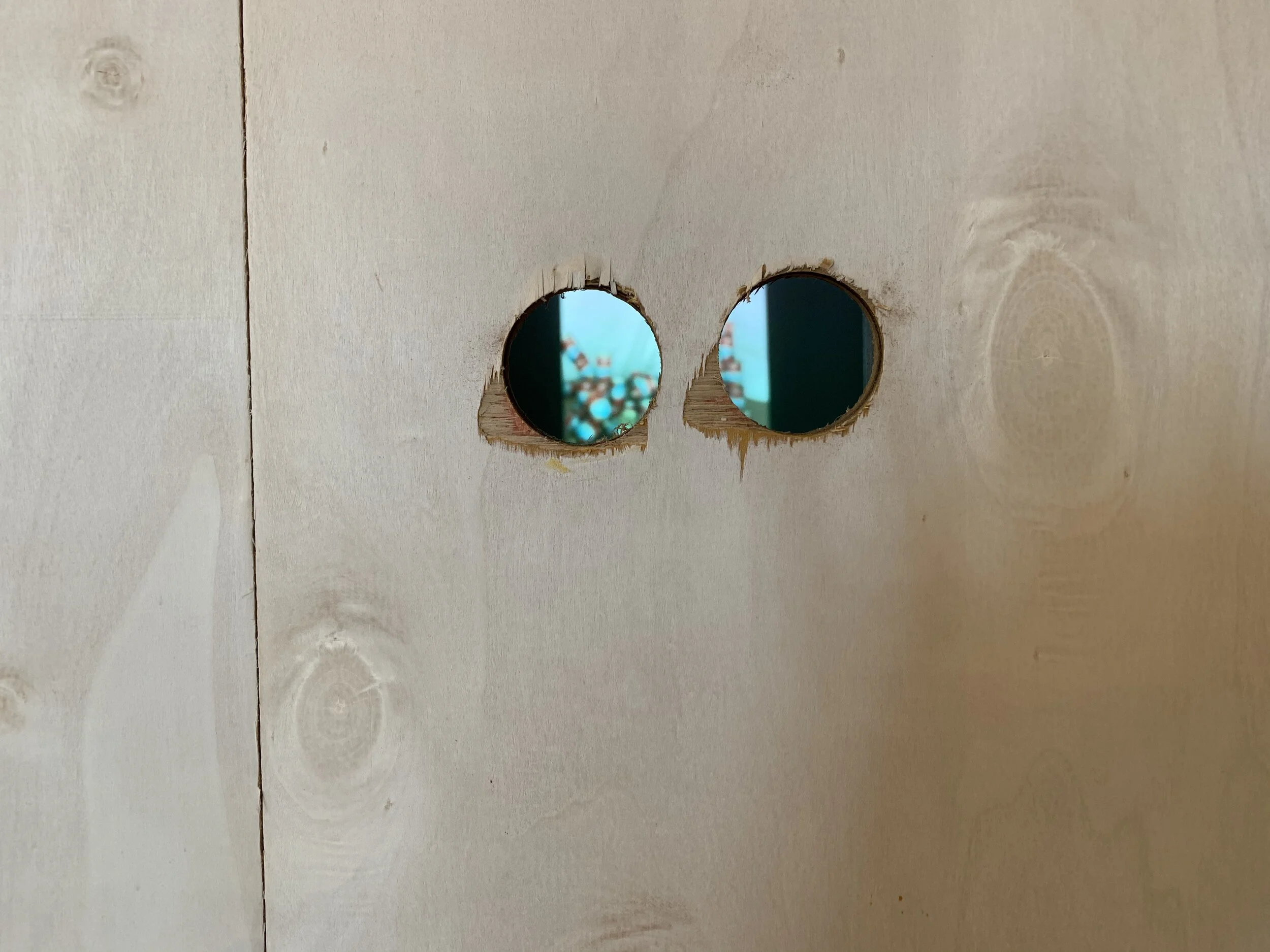 Shown in this installation is the video The toys & joys of 2020 on an upright screen which was viewable through two peepholes in the wooden wall construction.
